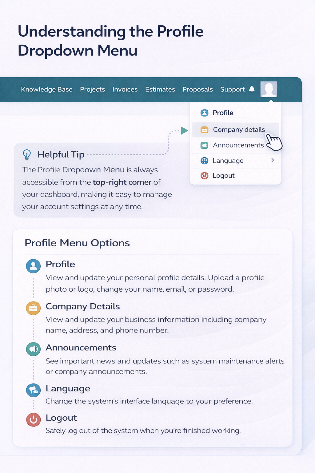 At the top of the sidebar, you’ll see your profile image or company logo, along with your name and email address. Clicking this area opens your profile options and account settings.